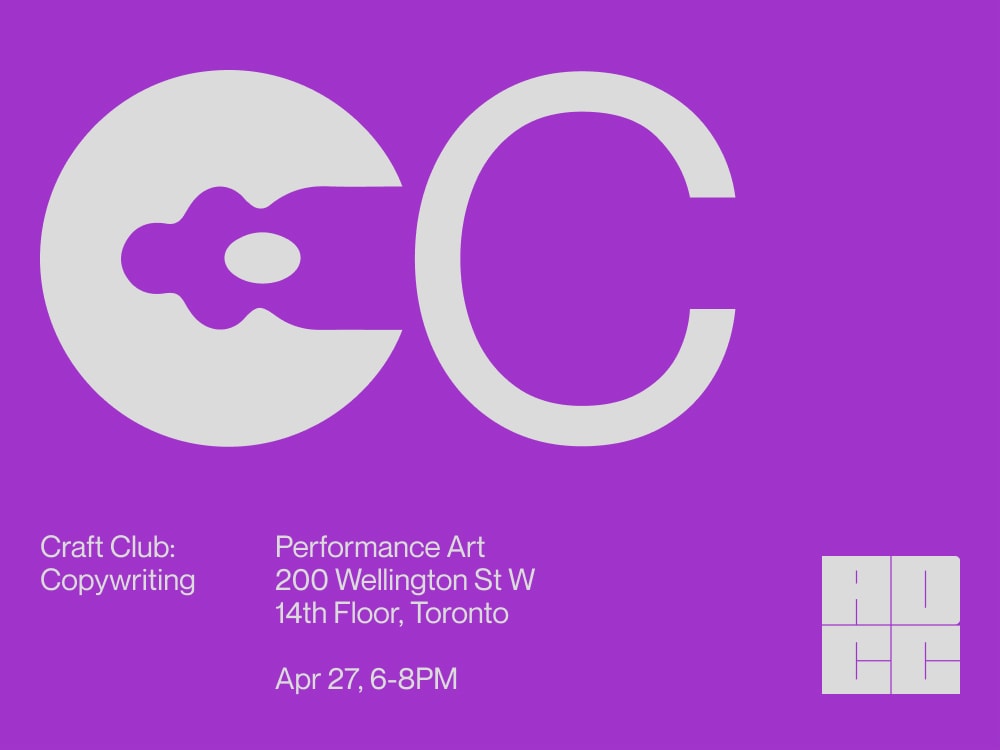 Introducing Craft Club: a new event series for the creative community focused on the craft behind our work. Our first edition of Craft Club is all about Copywriting, featuring a panel discussion with Xavier Blais (Rethink), Hemal Dhanjee (Courage), and Sanya Grujicic (Jam3), hosted by Ian Mackenzie (Performance Art). So come nerd out with us on April 27th at Performance Art. COST: Free for ADCC Members $10 + tax/fees for Non-Members SCHEDULE: 6pm - Doors open 6:30pm - Panel discussion